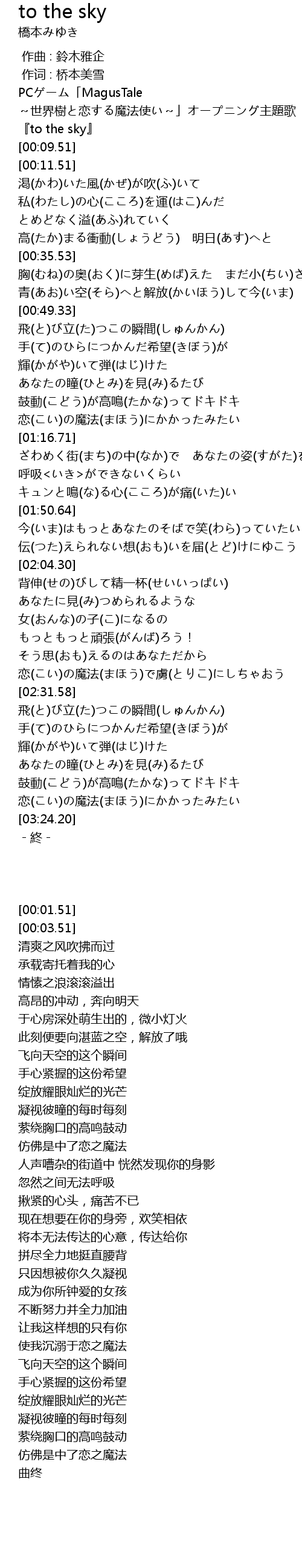 | [00:01.51] | PCゲーム「MagusTale ~世界樹と恋する魔法使い~」オープニング主題歌 |