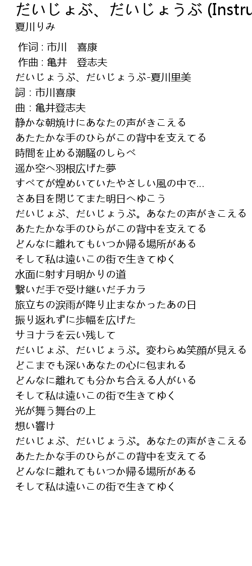 | [00:01.170] | だいじょうぶ、だいじょうぶ-夏川里美 |
