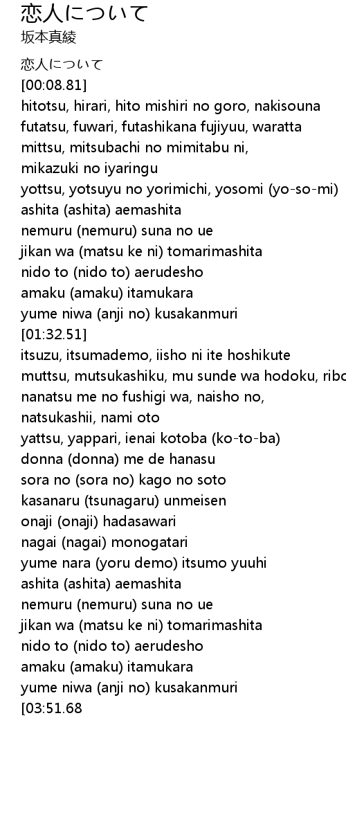 | [00:10.03] | hitotsu, hirari, hito mishiri no goro, nakisouna |