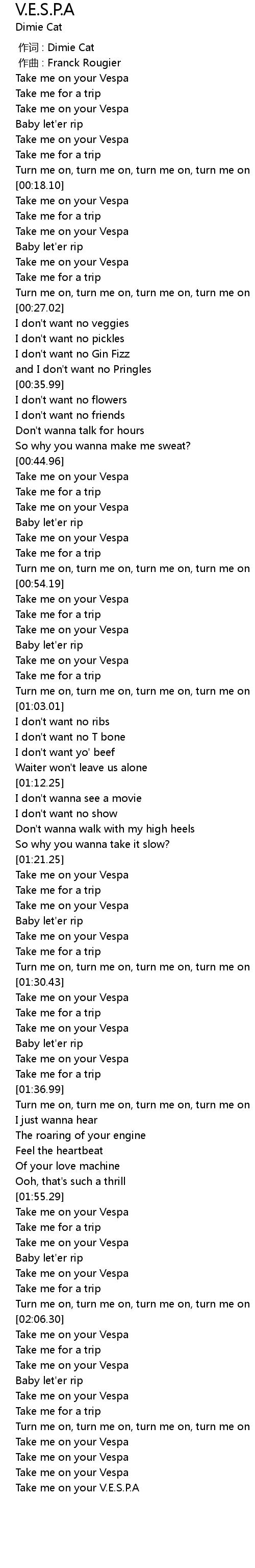| [02:33.93] | Take me on your V. E. S. P. A |