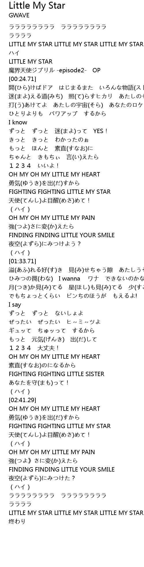 | [00:10.93] | LITTLE MY STAR LITTLE MY STAR LITTLE MY STAR |