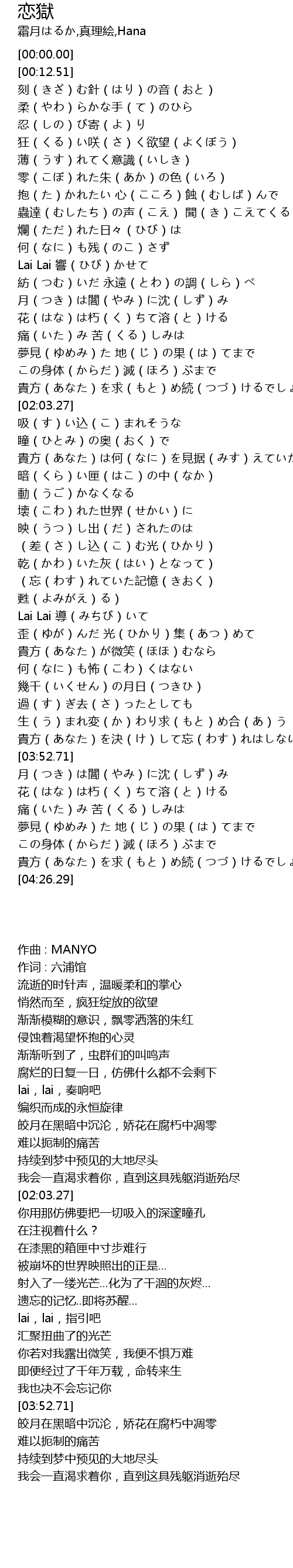 | [00:36.29] | 忍(しの)び寄(よ)り 狂(くる)い咲(さ)く欲望(よくぼう) |