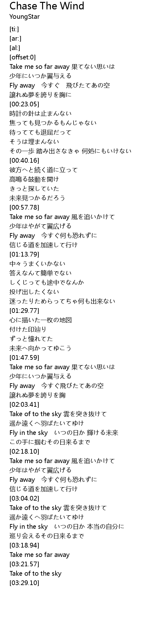 | [00:58.96] | Take me so far away 風を追いかけて |