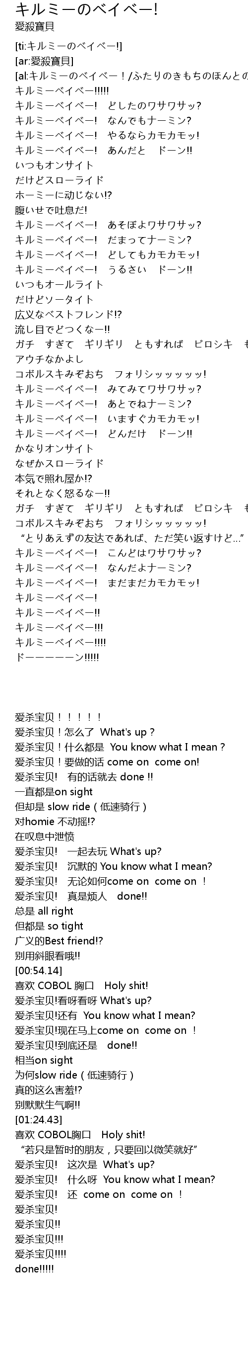 | [00:21.54] | キルミーベイベー! あんだと ドーン!! |