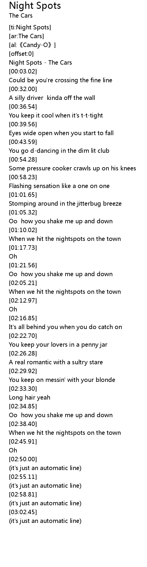 | [00:00.59] | Night Spots The Cars |