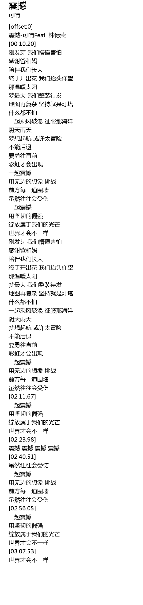 | [00:01.59] | 震撼-可晴Feat. 林德荣 |