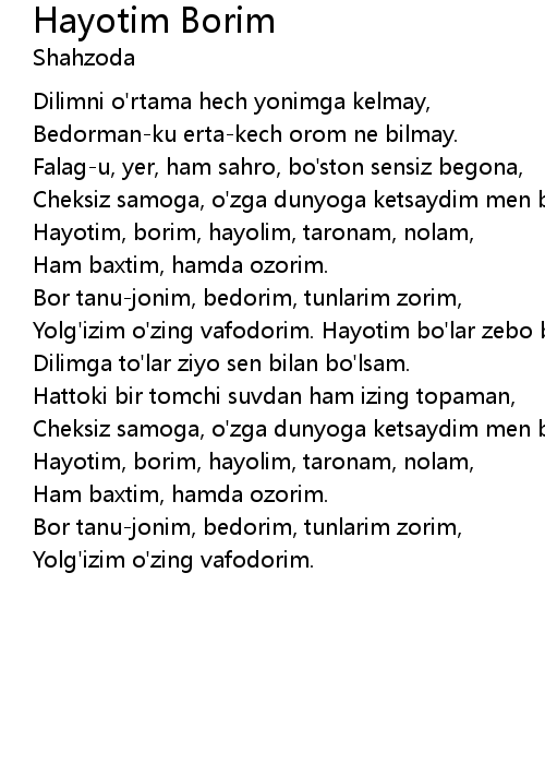 | Yolg'izim o'zing vafodorim. Hayotim bo'lar zebo bir seni sevsam, | |