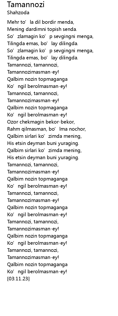 | [02:58.86] | Ko’ngil berolmasman-ey! |