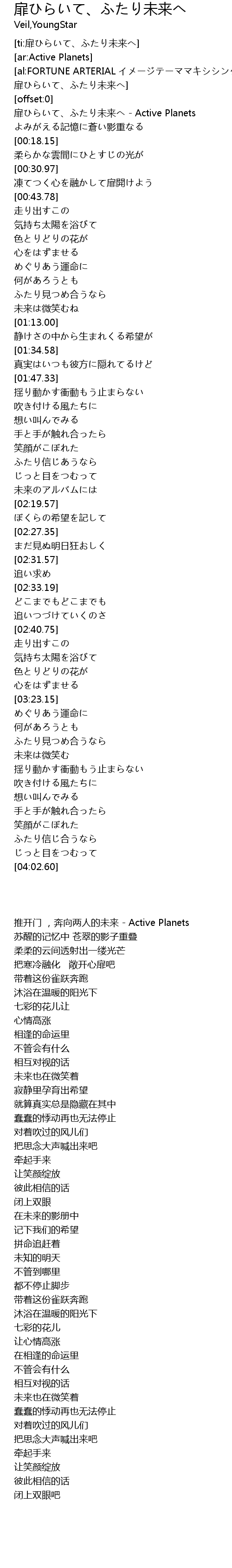 | [00:02.26] | 扉ひらいて、ふたり未来へ - Active Planets |