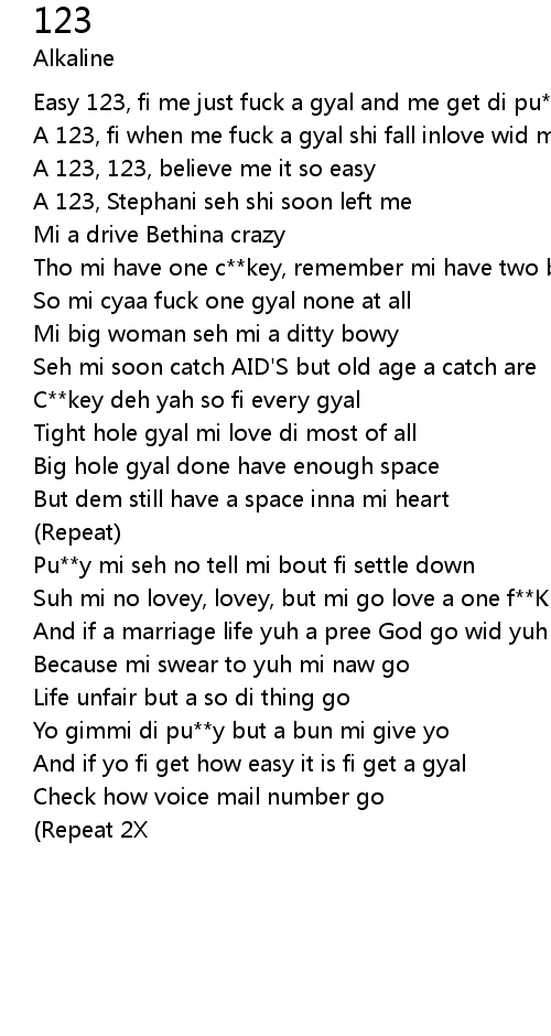 | Easy 123, fi me just fuck a gyal and me get di pu**y | |