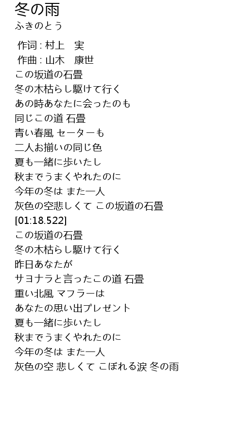 | [00:17.291] | 冬の木枯らし駆けて行く |