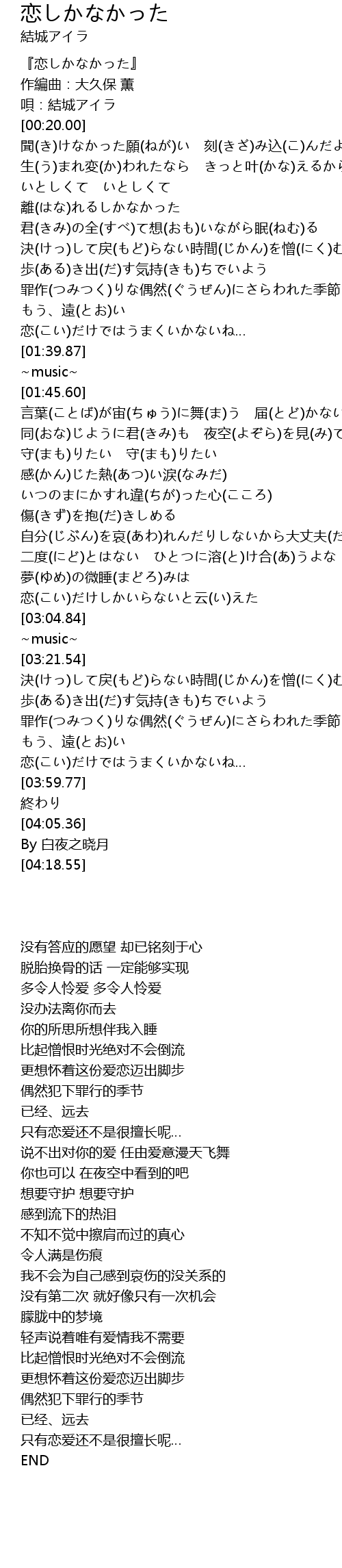 | [03:50.38] | 恋(こい)だけではうまくいかないね… |