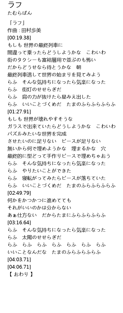 | [01:19.03] | らふ いいことづくめだ たまのふらふらふらふ |