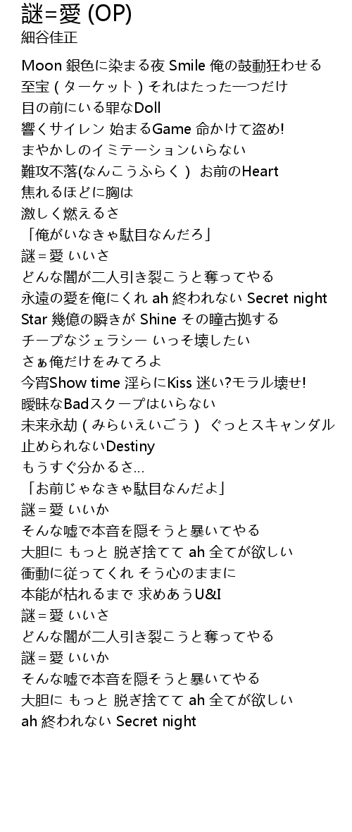 | [03:49.850] | 謎=愛 いいさ どんな闇が二人引き裂こうと奪ってやる |