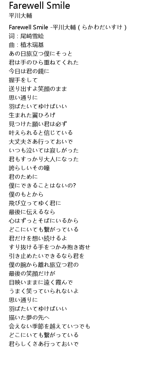 | [00:00.00] | Farewell Smile -平川大輔(らかわだいすけ) |