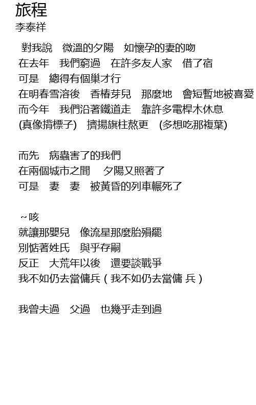 | 而今年 我們沿著鐵道走 靠許多電桿木休息 | |