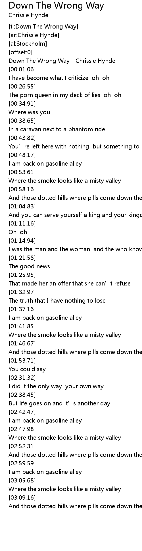 | [00:00.25] | Down The Wrong Way Chrissie Hynde |
