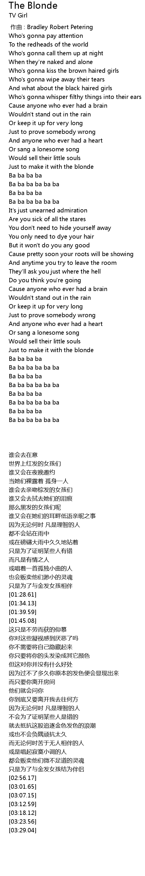 | [00:45.53] | Who's gonna kiss the brown haired girls |