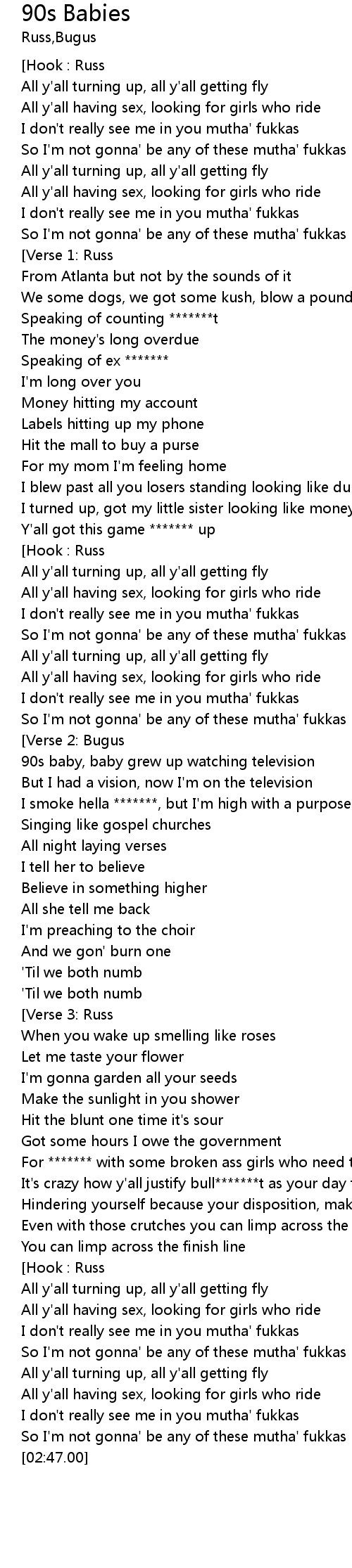| [02:04.17] | For ******* with some broken ass girls who need their mother |