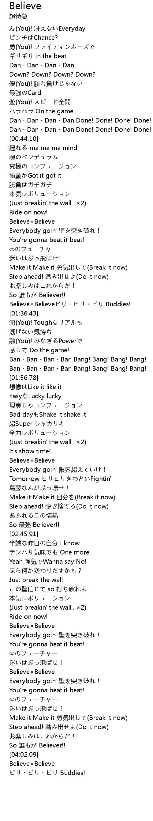 | [01:33.57] | Believe×Believeビリ・ビリ・ビリ Buddies! |