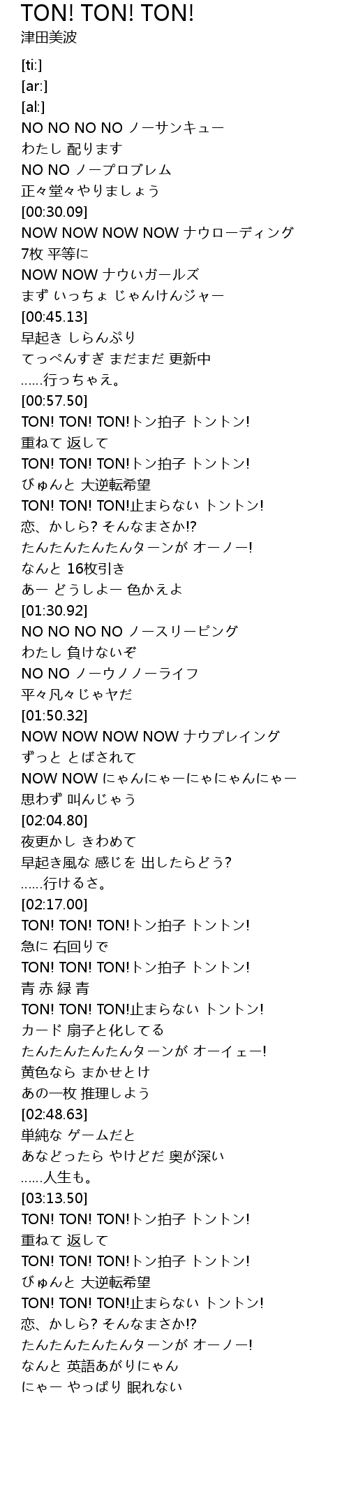 | [03:24.52] | TON! TON! TON! zhǐ ! |