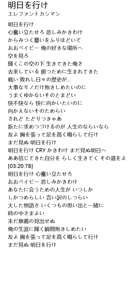 | [03:27.84] | 明日を行け 心奮い立たせろ |