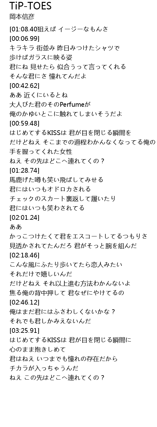 | [00:53.75] | 俺のかゆいとこに触れてしまいそうだよ |