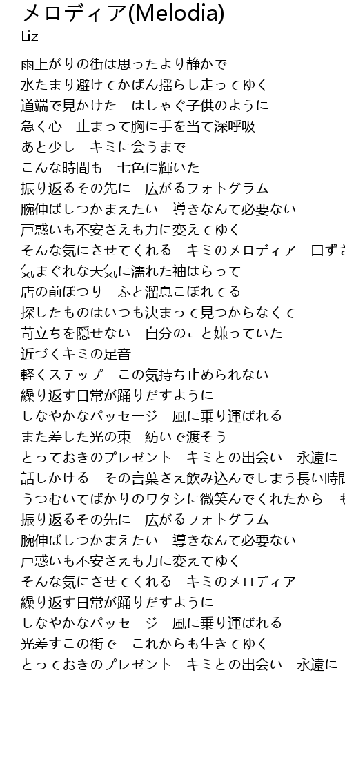 | [01:14.93] | そんな気にさせてくれる キミのメロディア 口ずさむ |