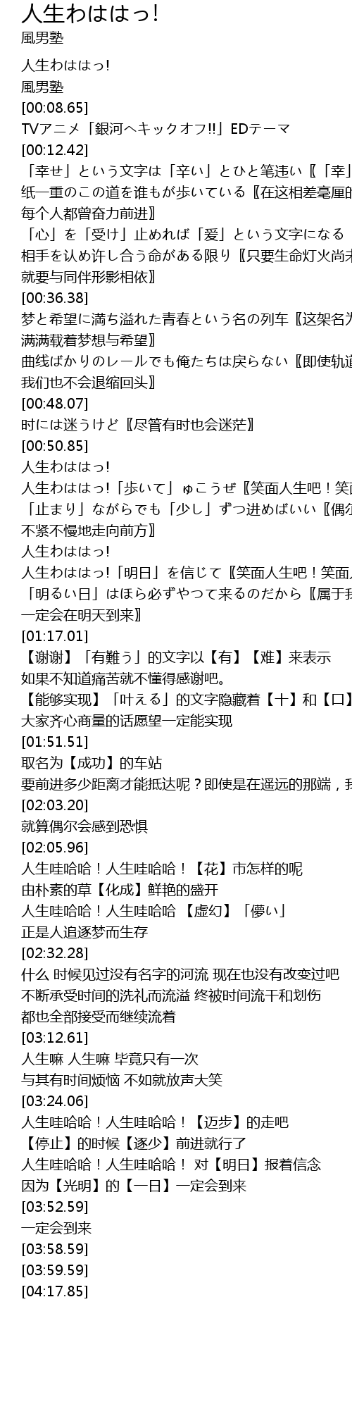 | [00:51.14] | 人生わははっ! 人生わははっ!「歩いて」ゅこうぜ〖笑面人生吧!笑面人生吧!笑着向前进吧〗 |