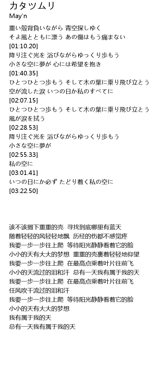 | [00:45.71] | 重い殻背負いながら 青空探しゆく |