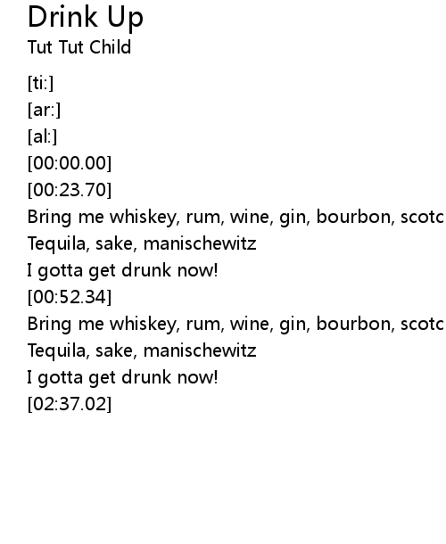 | [00:41.32] | Bring me whiskey, rum, wine, gin, bourbon, scotch, rye |