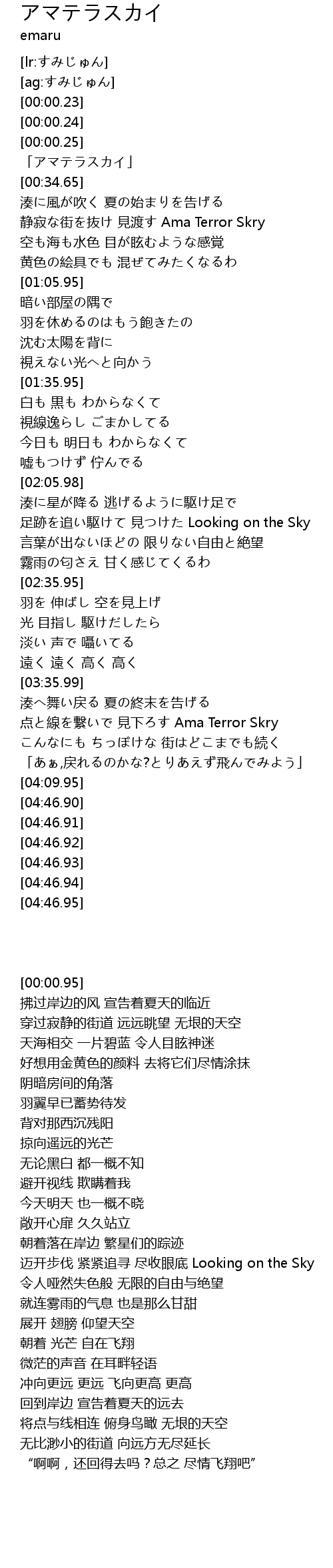 | [00:43.01] | 静寂な街を抜け 見渡す Ama Terror Skry |