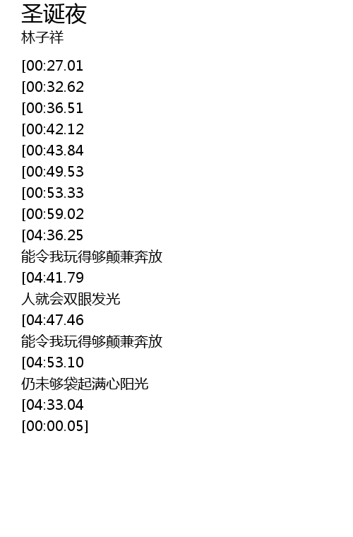 | [05:10.05][04:41.79][04:13.57][03:45.40][02:26.49][01:06.04] | 有你做我圣诞夜 人就会双眼发光 |