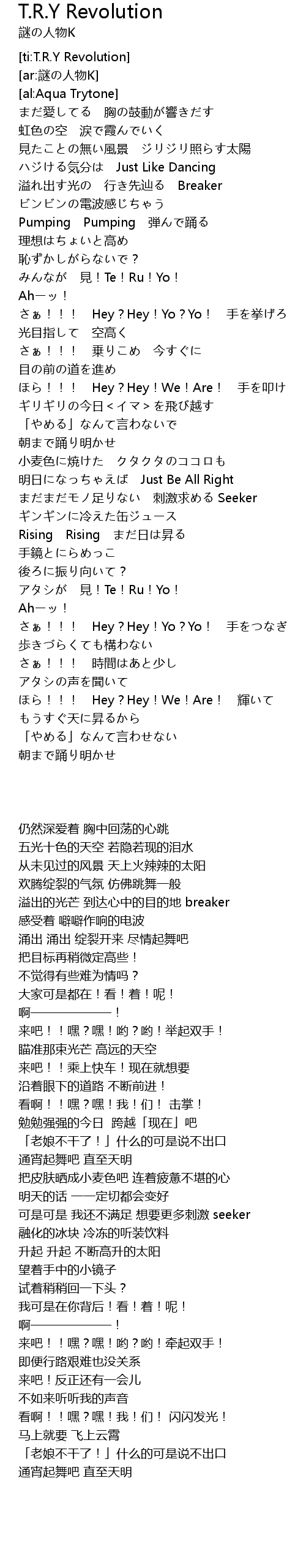 | [01:54.67] | !!! Hey? Hey! Yo? Yo! shǒu jǔ |