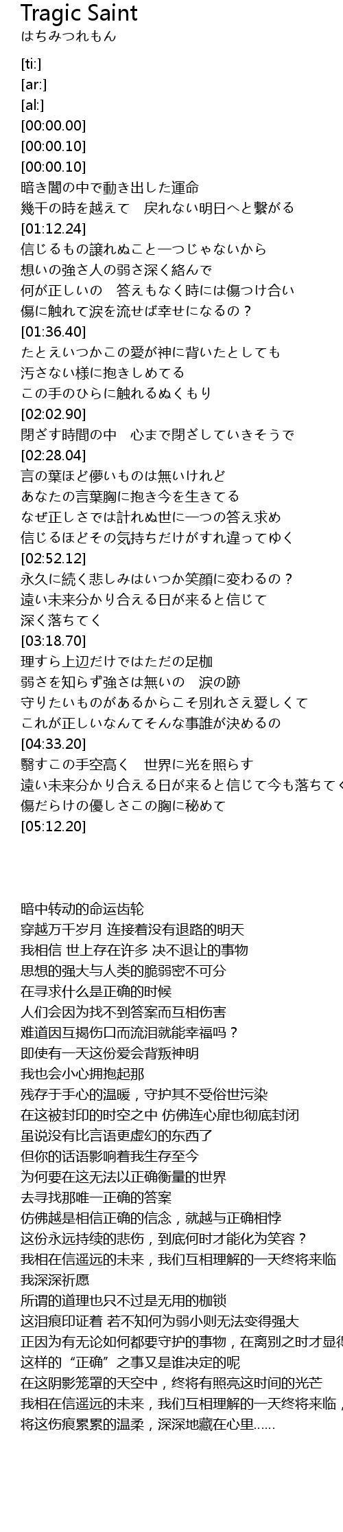 | [04:46.15] | 遠い未来分かり合える日が来ると信じて今も落ちてく |