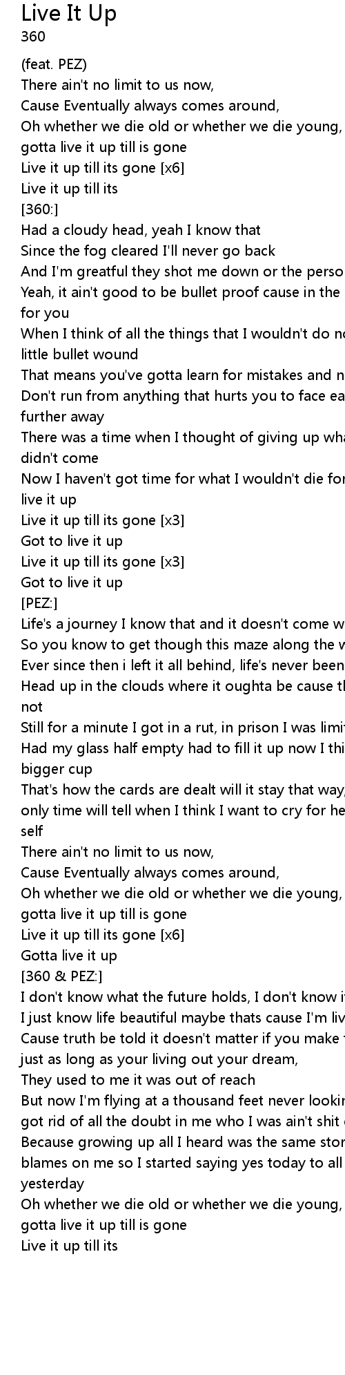 | Now I haven't got time for what I wouldn't die for I know that life's short so live it up | |