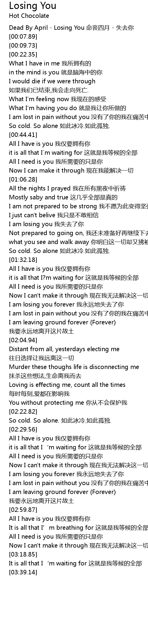| [00:01.12] | Dead By April - Losing You 命丧四月 - 失去你 |