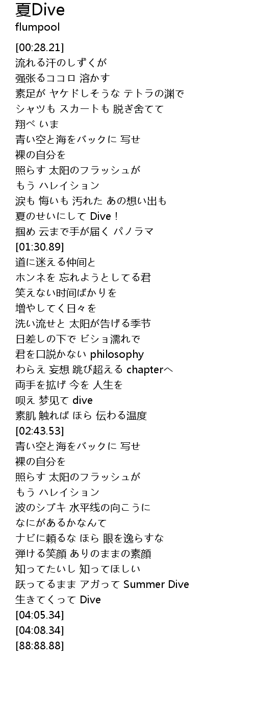 | [03:49.83] | 跃ってるまま アガって Summer Dive |