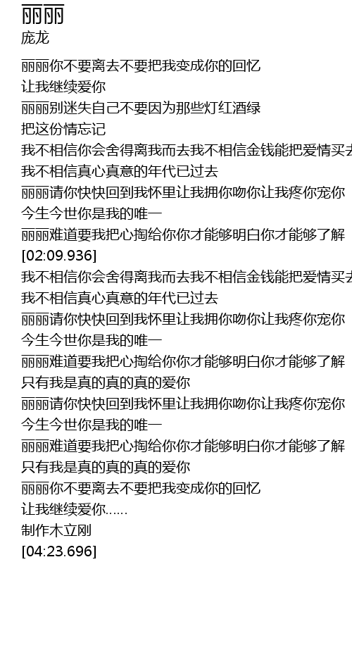 | [01:41.695] | 丽丽请你快快回到我怀里让我拥你吻你让我疼你宠你 |