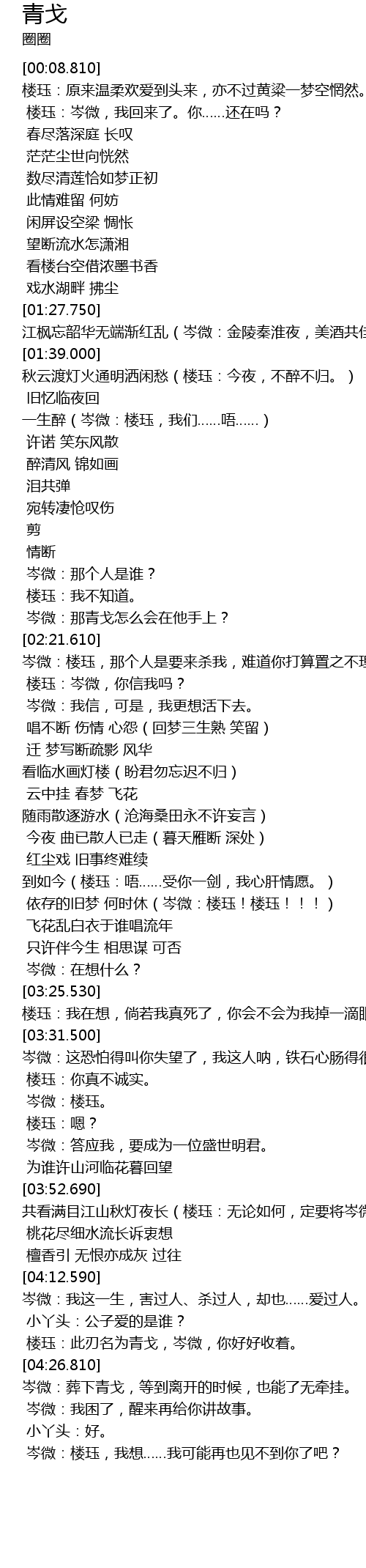 | [04:20.750] | 楼珏:此刃名为青戈,岑微,你好好收着。 |
