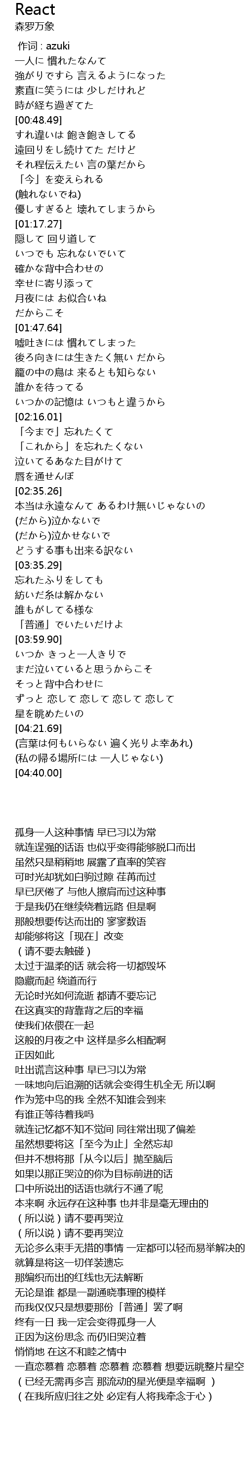 | [04:21.70] | (言葉は何もいらない 遍く光りよ幸あれ) |