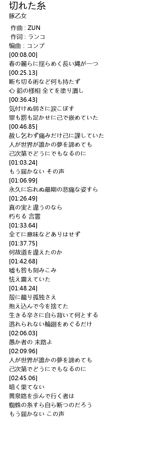 | [02:51.40] | 蜘蛛の糸すら自ら断つのだろう |