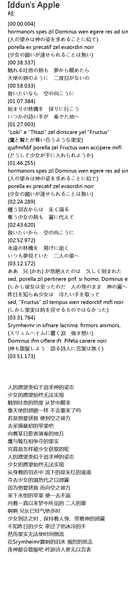 | [01:27.055] | "Loki" e "Thiazi" zel dimicare yel "Fructus" (鷹と鷲とが奪い合うような果実) |