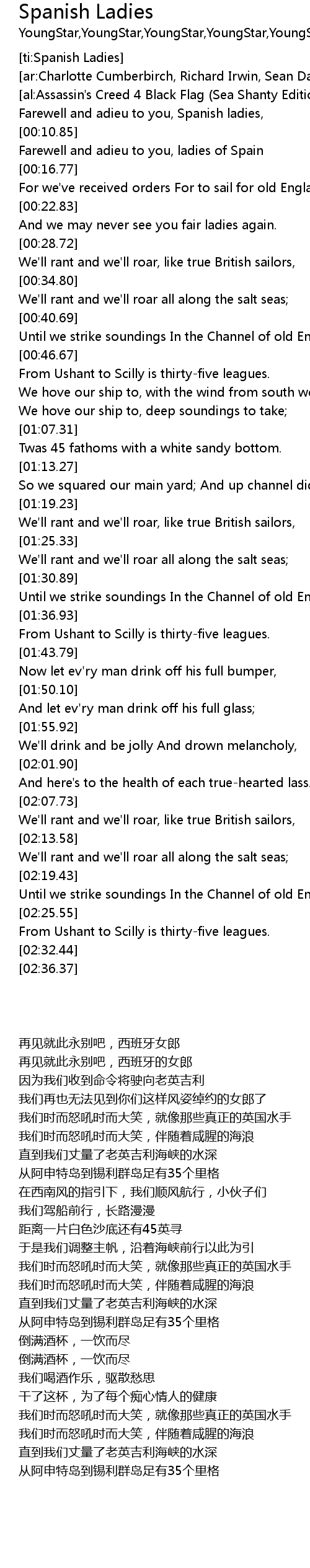 | [00:05.41] | Farewell and adieu to you, Spanish ladies, |