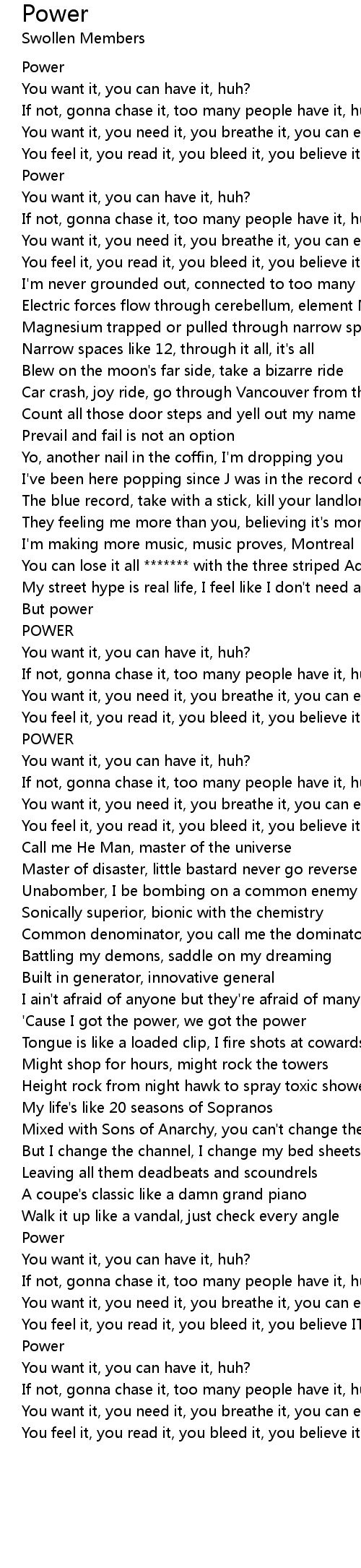 You feel it, you read it, you bleed it, you believe it's all power |