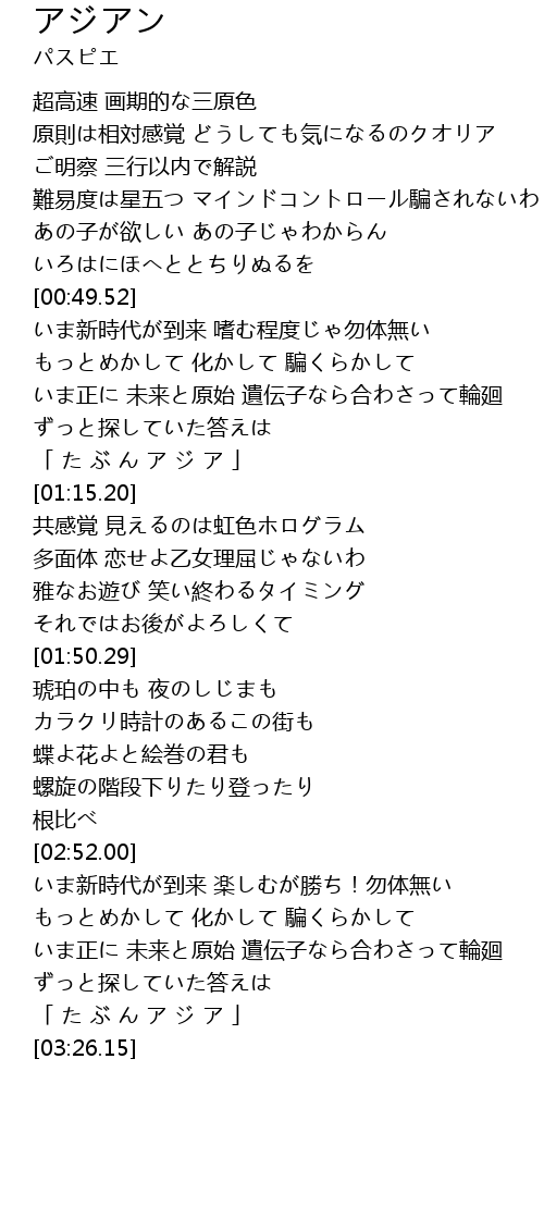 | [03:24.03] | 「 た ぶ ん ア ジ ア 」 |