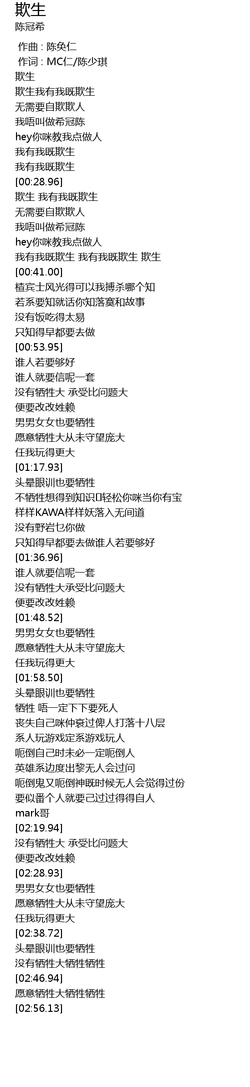 | [00:29.90] | 欺生 我有我既欺生 |
