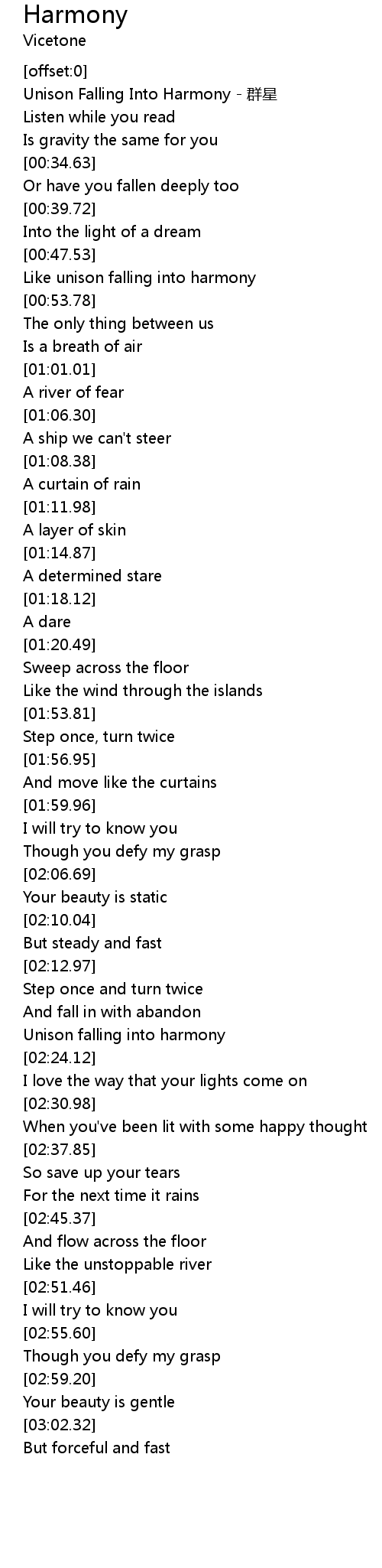 | [00:49.74] | Like unison falling into harmony |