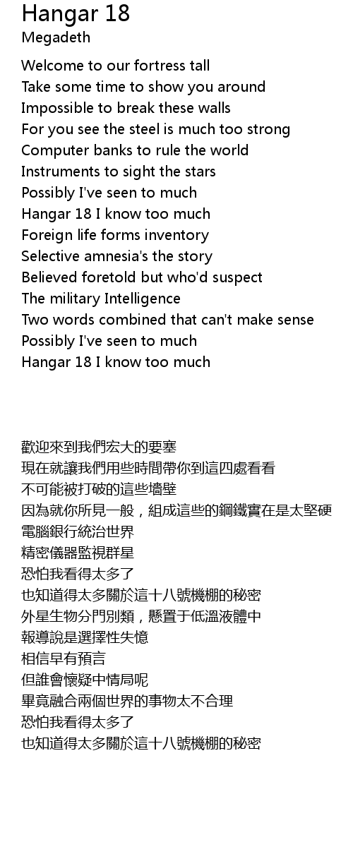 | [02:20.98] | Hangar 18 I know too much |