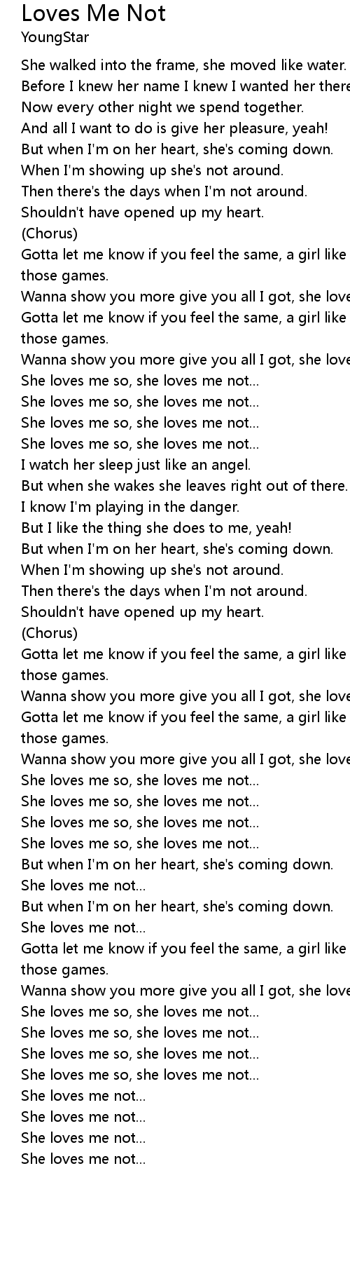 Wanna show you more give you all I got, she loves me so, she loves me not... |